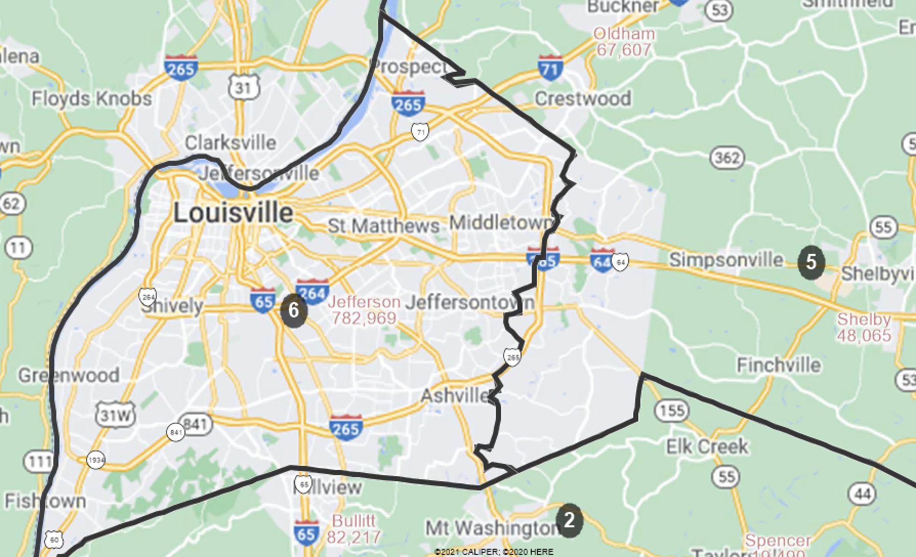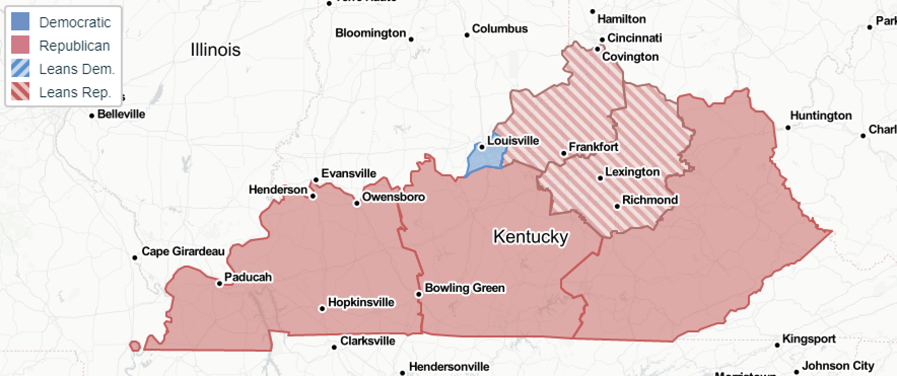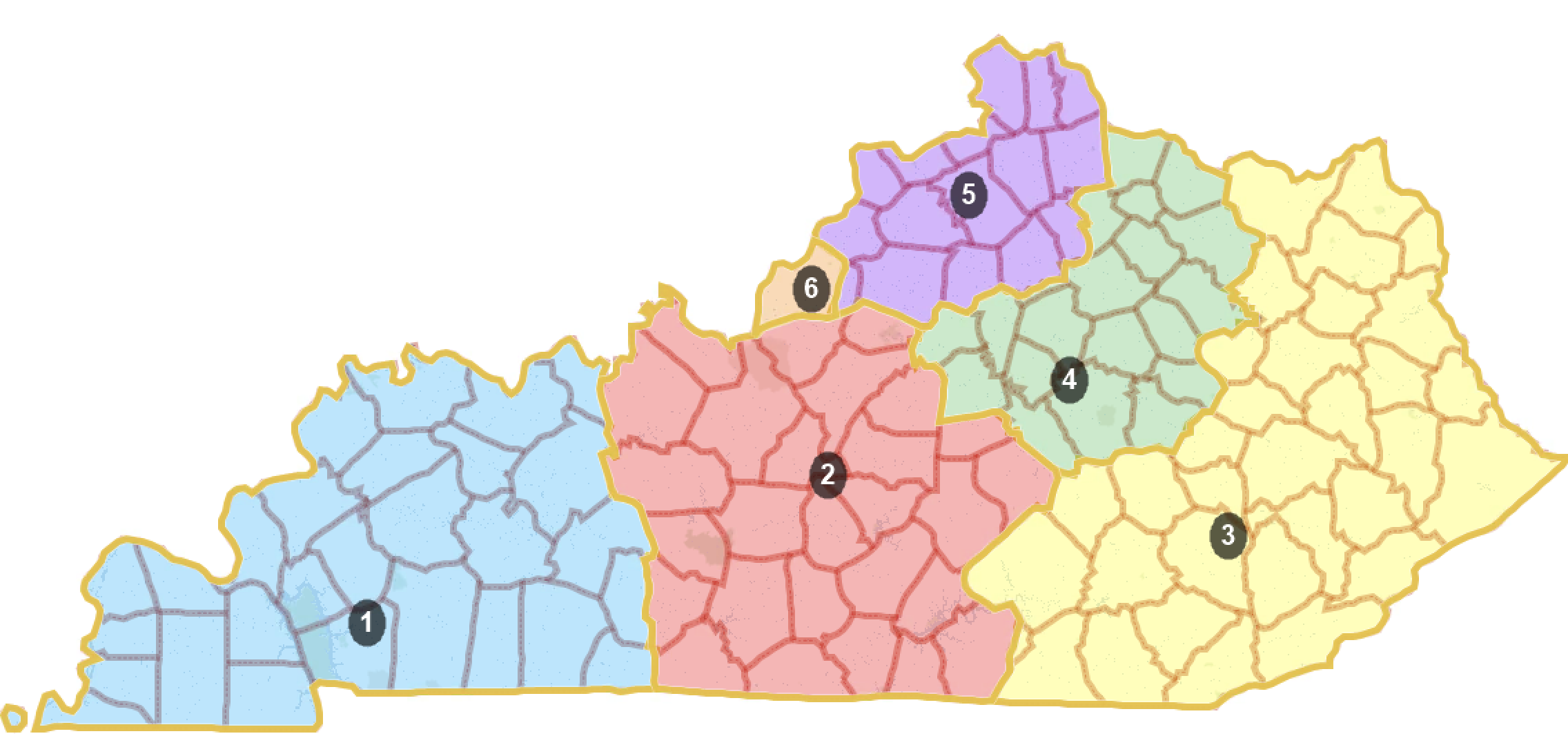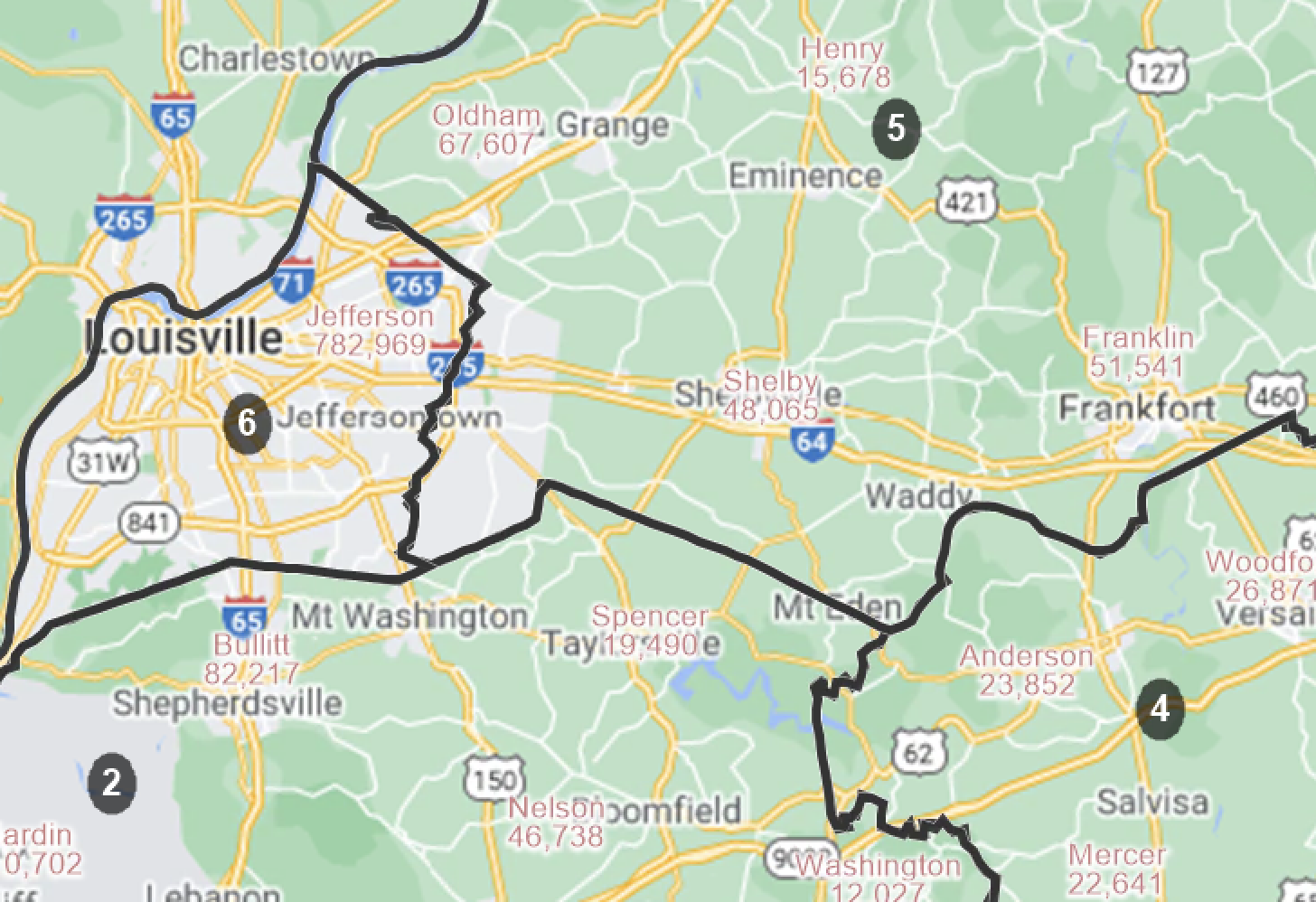This map maximizes compactness (mean Reock score is .5) while minimizing county splits to create a compliant, perfect population distribution map. Louisville is split between two counties, but the rest of Kentucky's major cities are kept intact, including Lexington. Kentucky's current Congressional district map is significantly less compact, especially in district 1. This map will likely maintain the current political balance in the state and is projected to yield 5 R, 1 D representation in Washington.