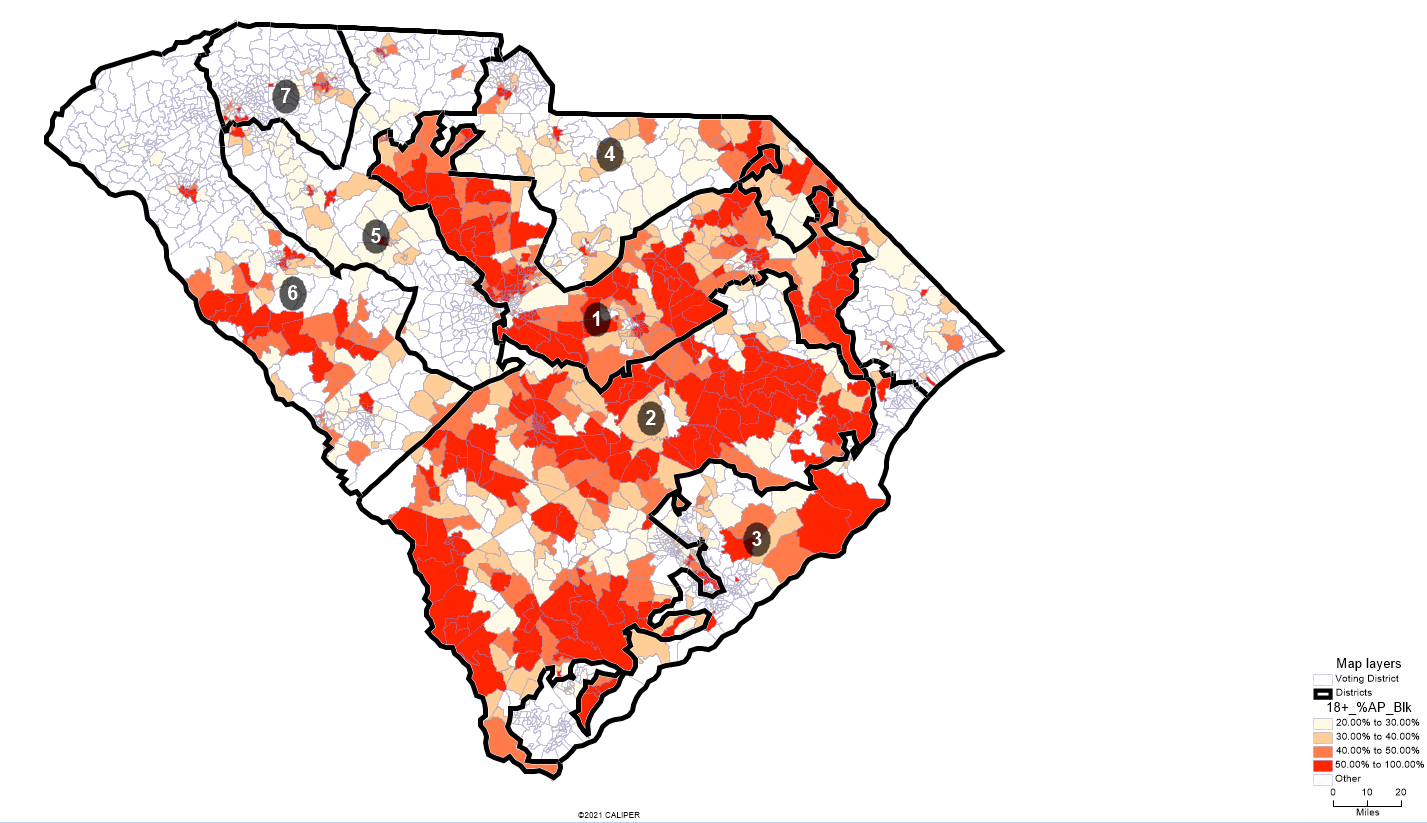This proposed plan for South Carolina’s Congressional districts based on 2020 Census data seeks to maximize the Black voting age population’s opportunity to elect candidates of their choice. Following the 2020 Census, South Carolina continues to be entitled to seven Congressional districts. Since it is mathematically impossible to draw two majority Black districts, this plan consists of one majority Black district (50.53% BVAP) and one plurality Black district (45% BVAP) that includes White Democrats who cross over to support the plurality’s preferred candidate. One significant tradeoff of the plan is that its districts are not compact. Such a plan is particularly vulnerable to Shaw v. Reno-type Equal Protection challenges, given that the conscious use of race is necessary to produce the plurality Black district. Given those challenges, this map merely serves as a proof of concept rather than an operational scheme for implementation.
