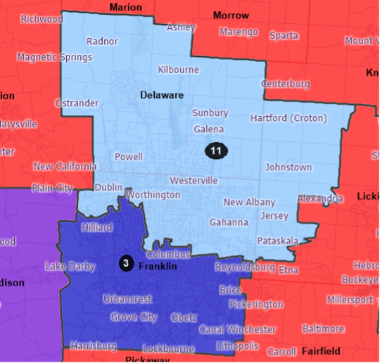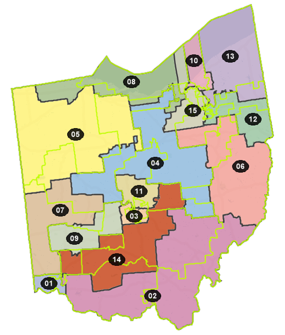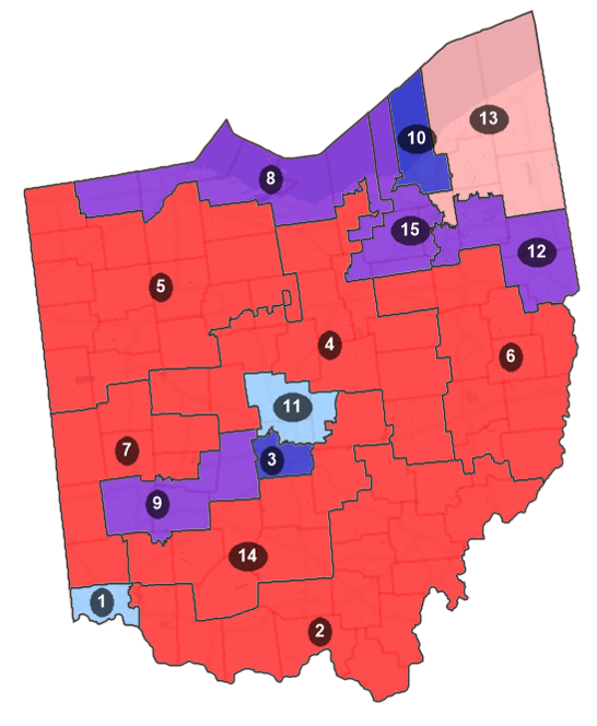 To promote partisan fairness and a congressional delegation that reflects the political landscape of the state, this proposed congressional district map for the state of Ohio prioritizes proportional representation and competitiveness as its core guiding principles. With seven safe Republican seats, four safe Democratic seats, and four competitive seats, this plan complies with the state constitutional prohibition against undue partisan gerrymandering. In addition to complying with federal and state law, this map was formulated with the goals of including entire counties within a district as much as possible, reducing county and voting district splits, and maintaining compactness and contiguity. As a result, the proposed map only splits a total of 16 counties and 69 voting districts–a notable improvement from the existing plan’s splitting of 23 counties and 268 voting districts.