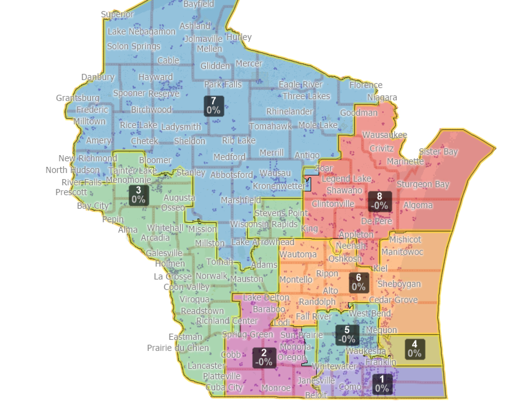 This map tries to make the least number of changes to Wisconsin's previous congressional map. One person/one vote principles require equal population across districts "as nearly as practicable." In complying with this legal standard, the changes made to this map (1) respect in-tact county and political subdivision lines as much as possible, and (2) equalizes population in areas where those county and political subdivision lines were already split in Wisconsin's previous map. Because of Wisconsin's unique demography, no minority population is large and compact enough to constitute the majority of any district under the Voting Rights Act.