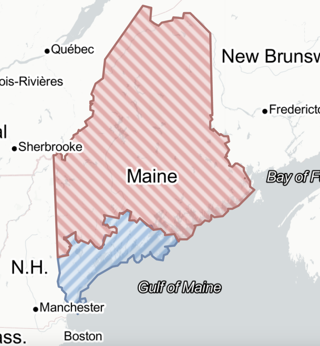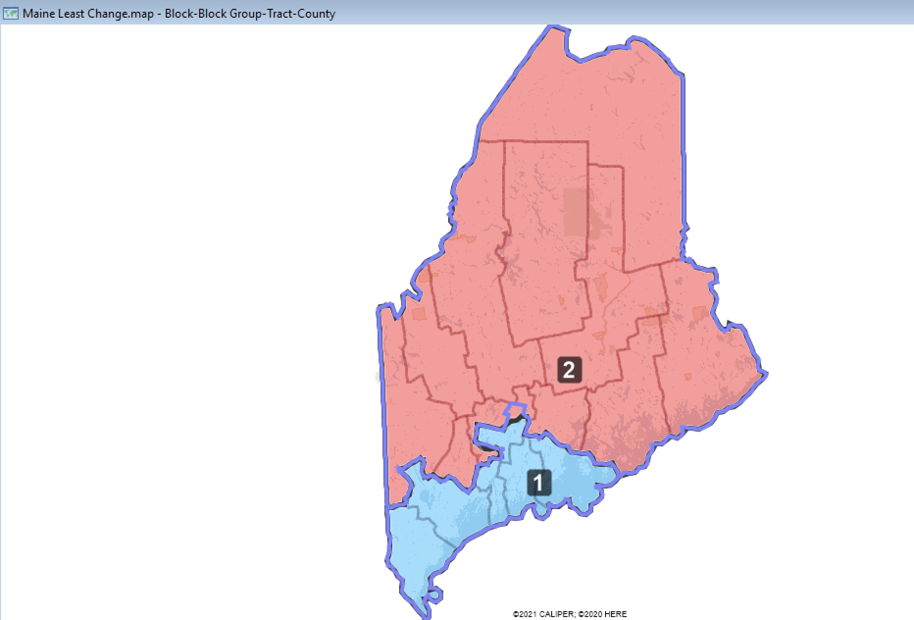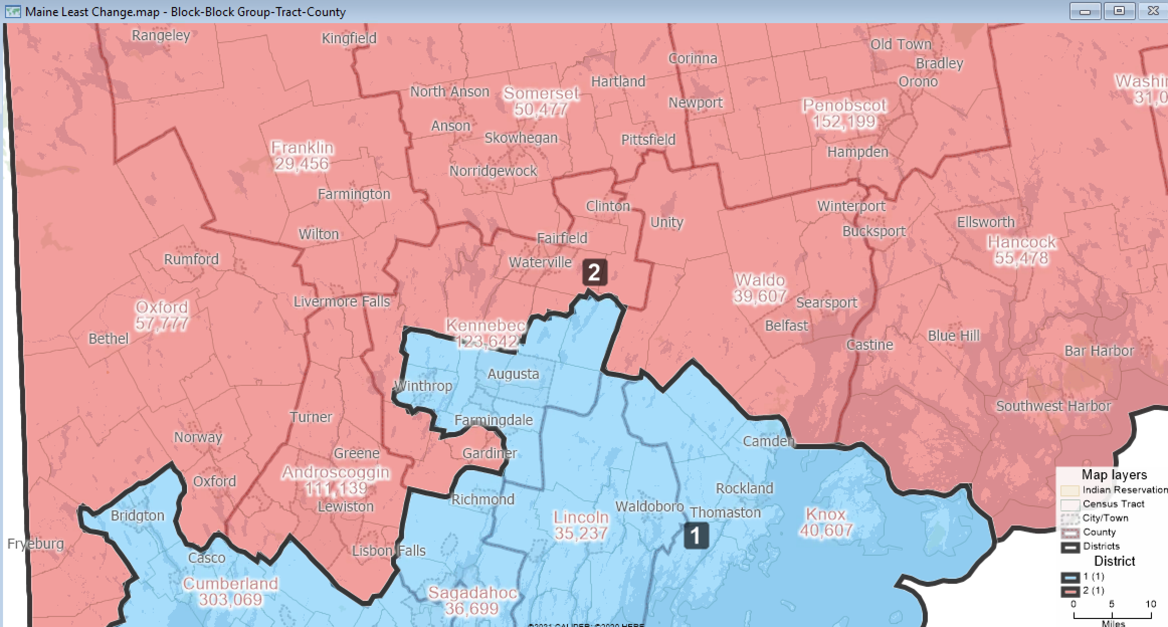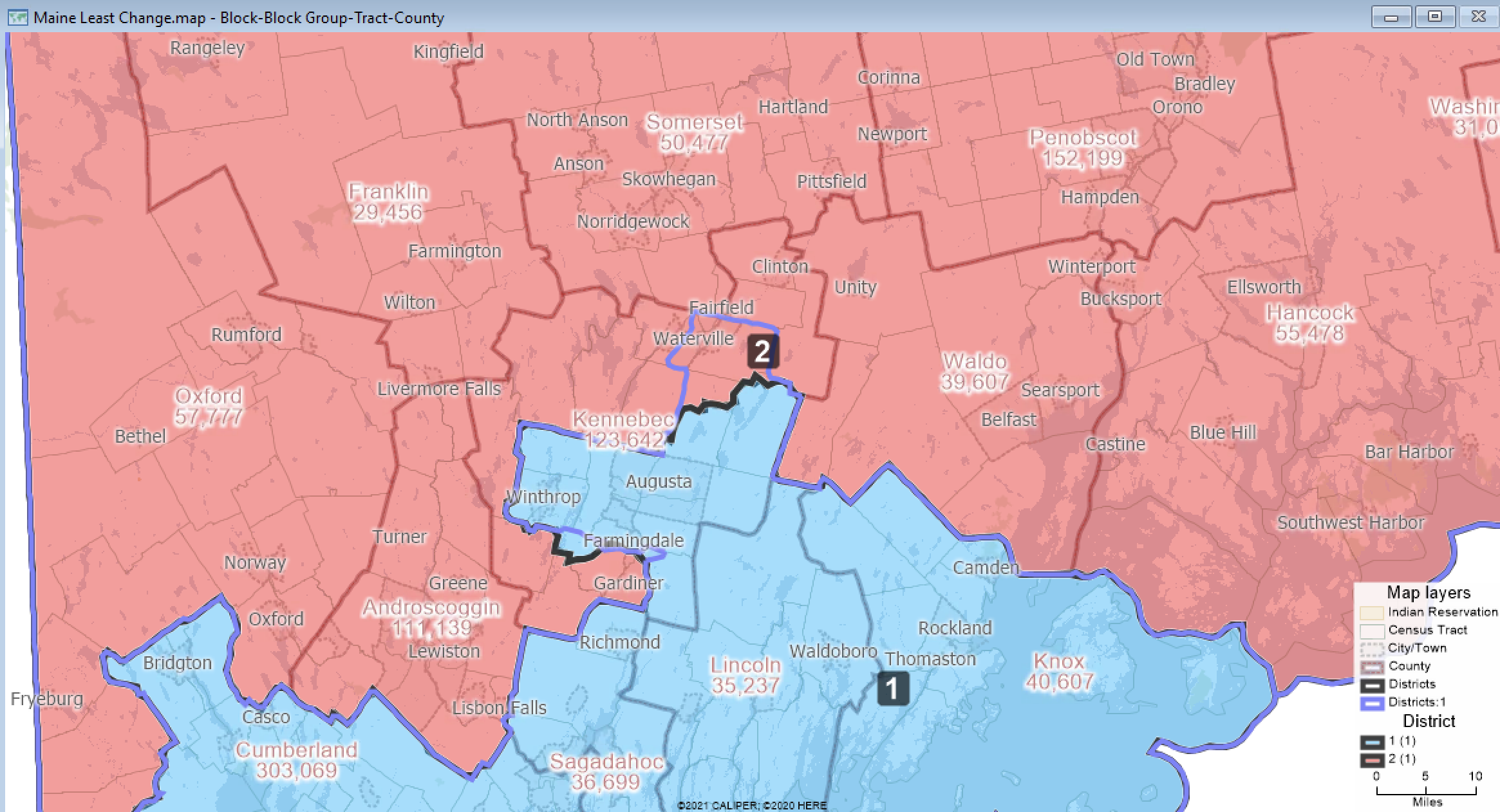 This map of Maine makes minimal changes to the state's 2010 map. Kennebec County, which the state split in 2010, remains the lone split county. Due to population growth in Southern Maine, the town of Waterville, which is located in Kennebec County, moves from the 1st District to the 2nd District. The state's capital, August, remains in the first district. This map complies with all legal requirements, including equal population. For a more detailed assessment of the map, see my longer memo.