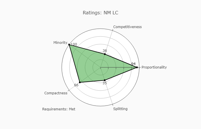 This perfect population map aims to follow New Mexico's current district lines as closely as possible while complying with all relevant federal and state laws. District 1 grew slightly, taking small areas around Paradise Hills from District 3 and taking the rest of Bernalillo County and a small portion of Valencia County from District 2. There were no other changes, and none of the changes significantly impacted the minority populations of each district, preserving VRA compatibility.